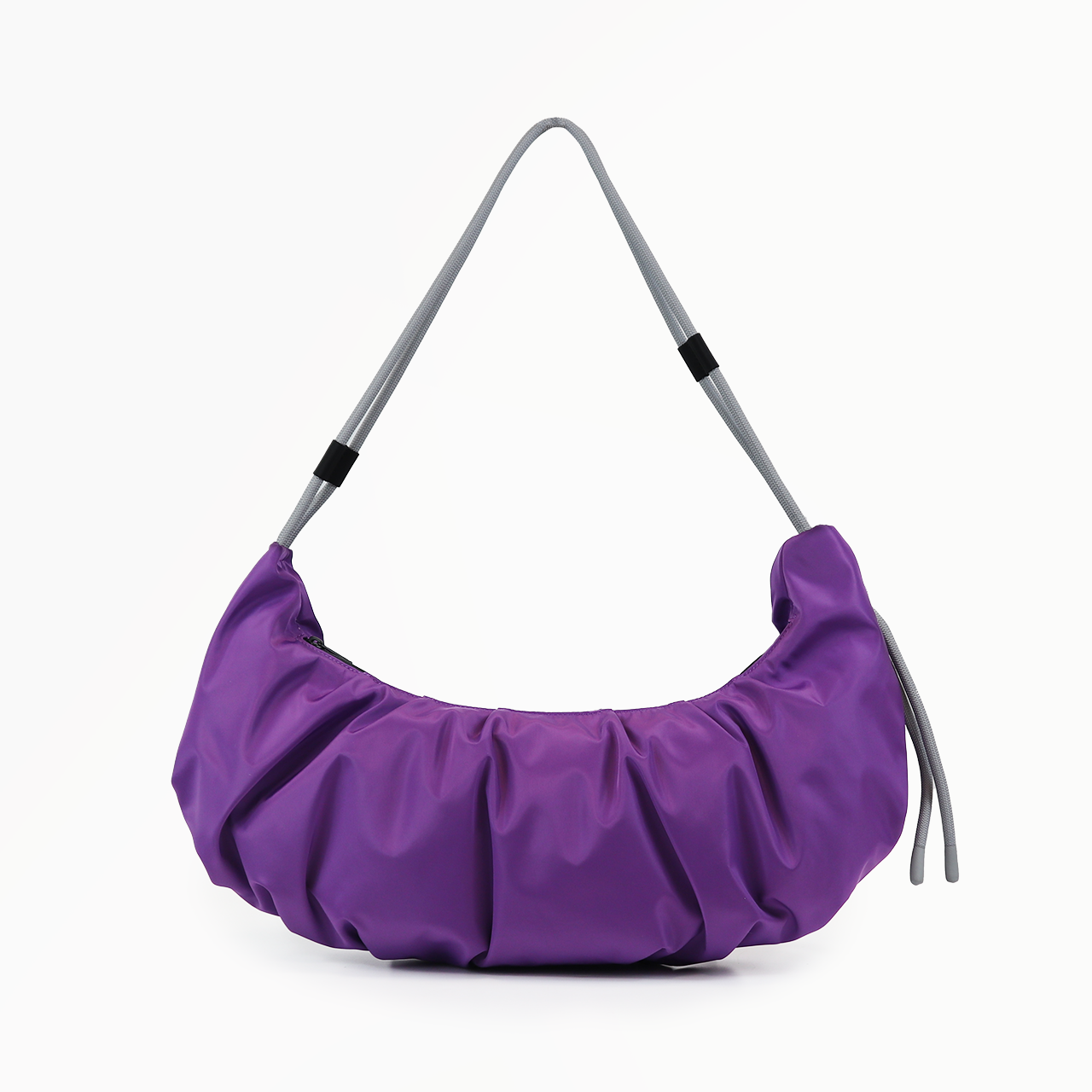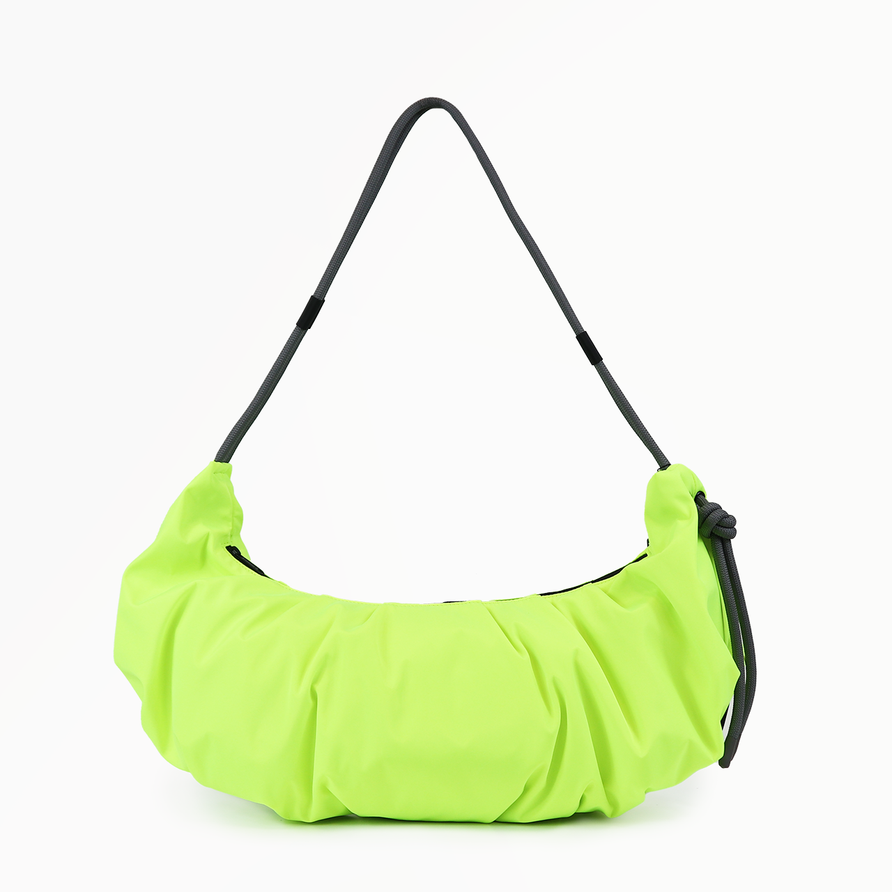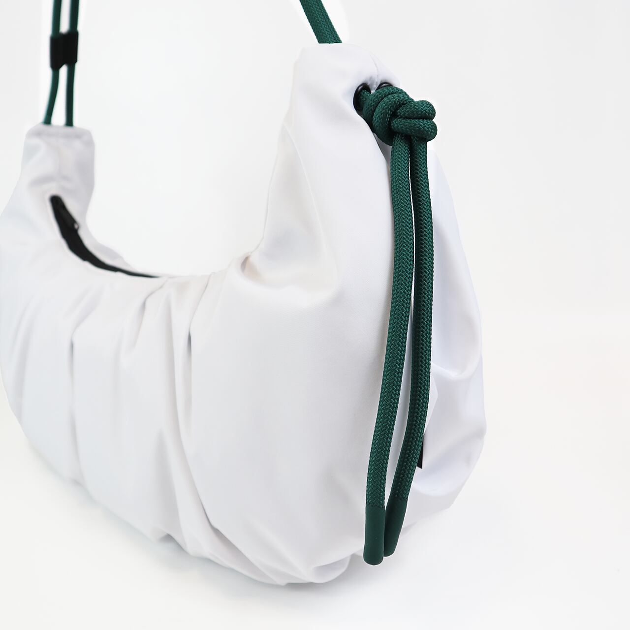 軽量のクロワッサン型バッグで、ロープの結び目を調整するとハンドバッグ/ショルダーバッグと早変わりします。