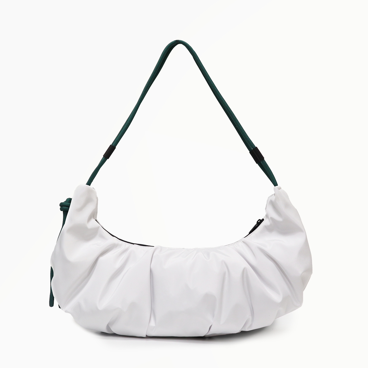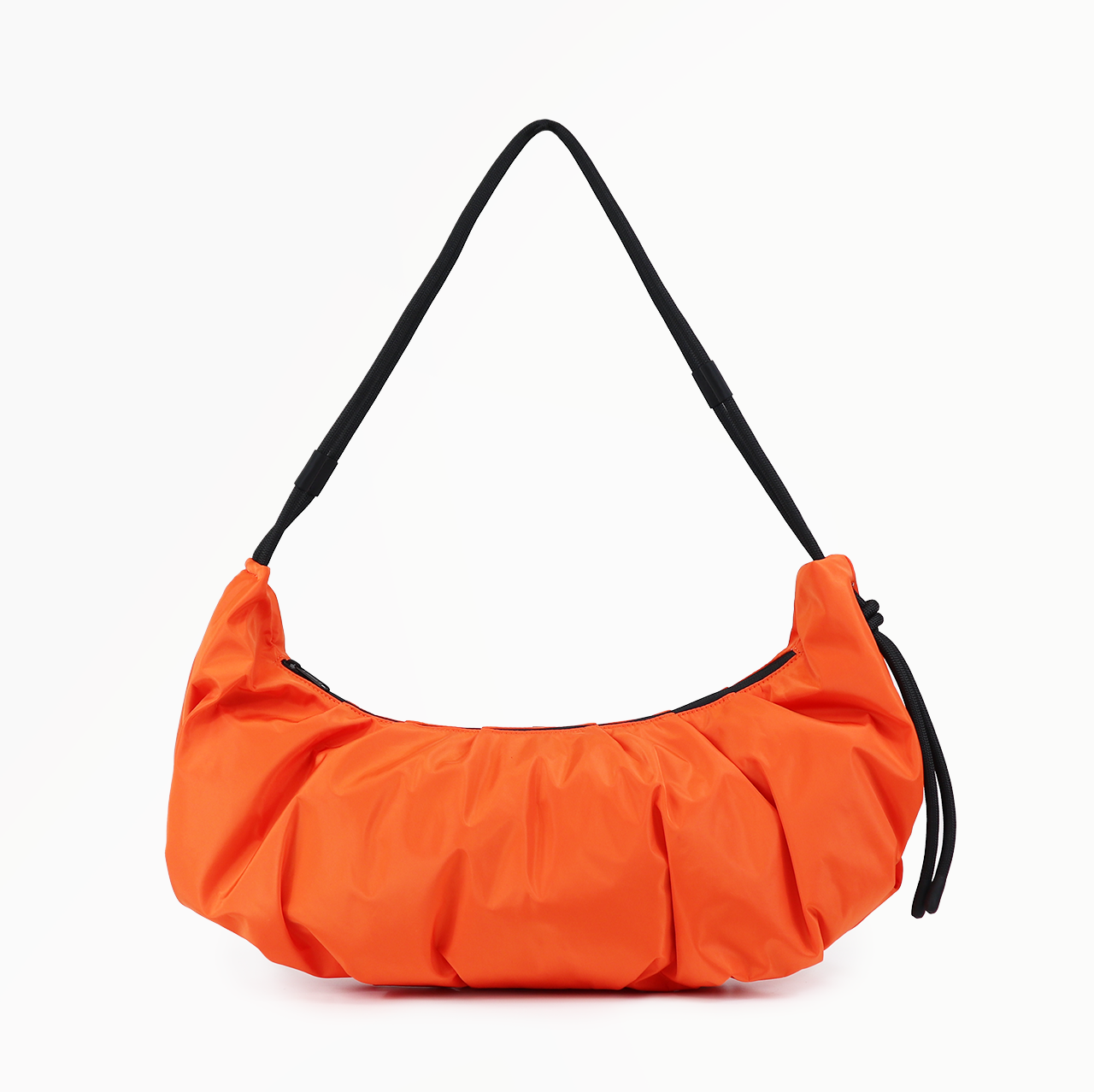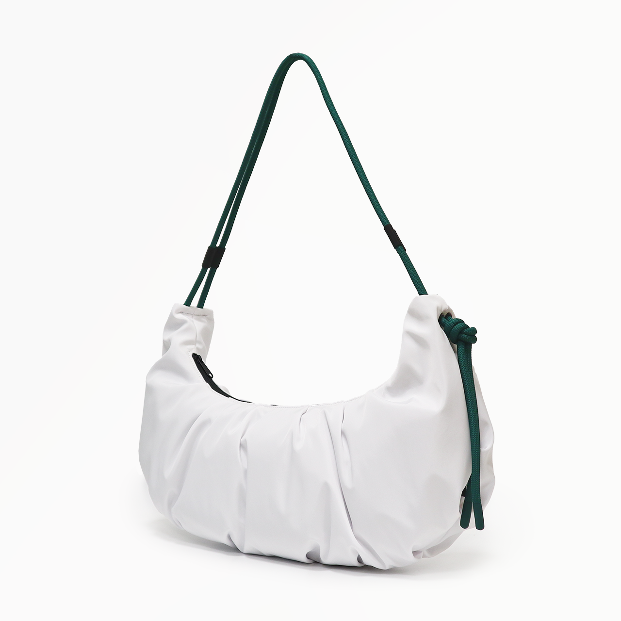 軽量のクロワッサン型バッグで、ロープの結び目を調整するとハンドバッグ/ショルダーバッグと早変わりします。
